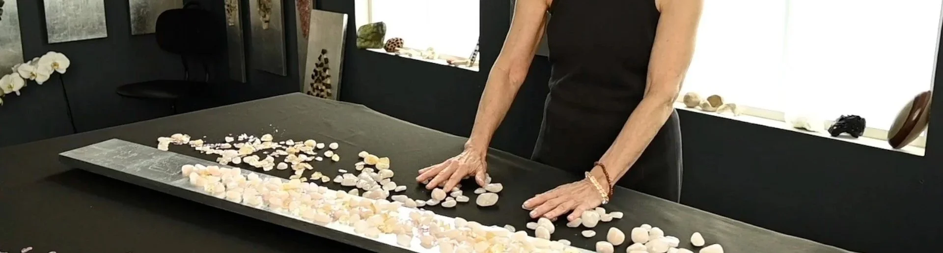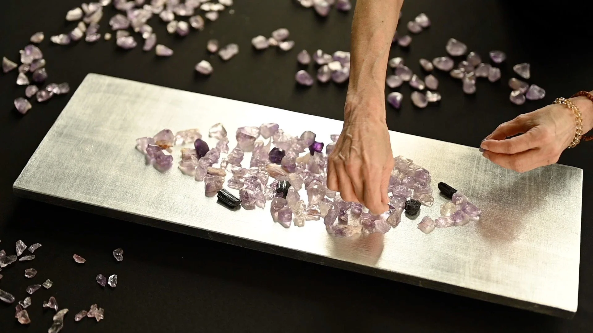 Each work is created through a contemplative, layered process guided by intention. Crystals are chosen for their energetic qualities. Holding and touching each stone becomes a grounding ritual of deep listening.